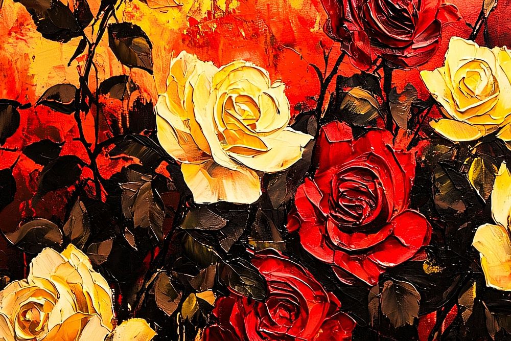 Dit prachtige schilderij met een weelderige compositie van rode en gele rozen brengt warmte en elegantie in elke ruimte. De vurige achtergrond met tinten van oranje, rood en geel creëert een dramatisch contrast met de donkere bladeren en bloemen, waardoor het kunstwerk een krachtig en expressief karakter krijgt. Perfect voor de woonkamer, hal of kantoor, dit stuk voegt een vleugje luxe en natuur toe aan uw interieur. Het is een ideaal cadeau voor bloemenliefhebbers en kunstverzamelaars.