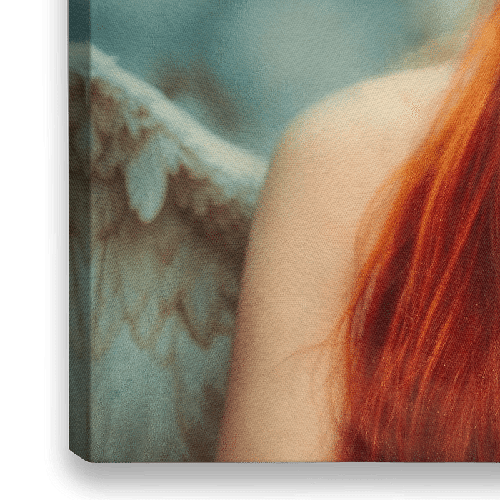 In deze betoverende fotomontage wordt de krachtige symboliek van een rode engel tot leven gebracht. Een jonge roodharige vrouw met een engelachtige uitstraling staat centraal in het beeld. Haar intense blik omlaag straalt zowel passie als onschuld uit, terwijl haar mysterieuze vleugels haar verbinden met de hemelse sfeer.