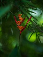 Deze rode tropische exotische bloem heb ik gefotografeerd op Bali. Indonesie. De felrode bladeren en oranje bloemen steken mooi af tegen de weelderige diepgroene achtergrond van onder andere varens en palmen. De omgeving waar deze bloem is gefotografeerd is de jungle van Ubud.