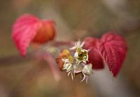 Rode frambozen winterbloesem - December is hier behoorlijk warm geweest en de planten bloeien om vervolgens over te gaan in vorst. Er is een mooi contrast tussen de warme en koele kleuren in deze macro van rode frambozenbloesem. De frambozenbloesem heeft een koele blauwgroene kleur terwijl de bladeren felrood zijn. De achtergrond is zachtgroen en bruin.