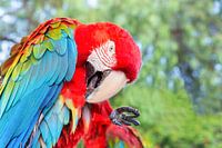 Rode ara of papegaai met blauw-groene vleugels die zijn veren schoonmaakt. Ik nam deze foto tijdens mijn vakantie in Albufeira in Portugal. Er zaten twee tamme rode ara's buiten bij een restaurant. Ik vond het leuk om een close-up foto te maken met meer details over de kop van deze kleurrijke vogel.
