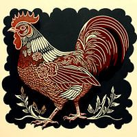 Rode haan - Een lino blok print van een haan, afgedrukt met rode inkt tegen een zwarte en cremekleurige achtergrond. De vogel hoort thuis op de boerderij op het platteland. Een afdruk leent zich goed voor een plek aan de muur in de keuken. Maar eigenlijk past hij overal!