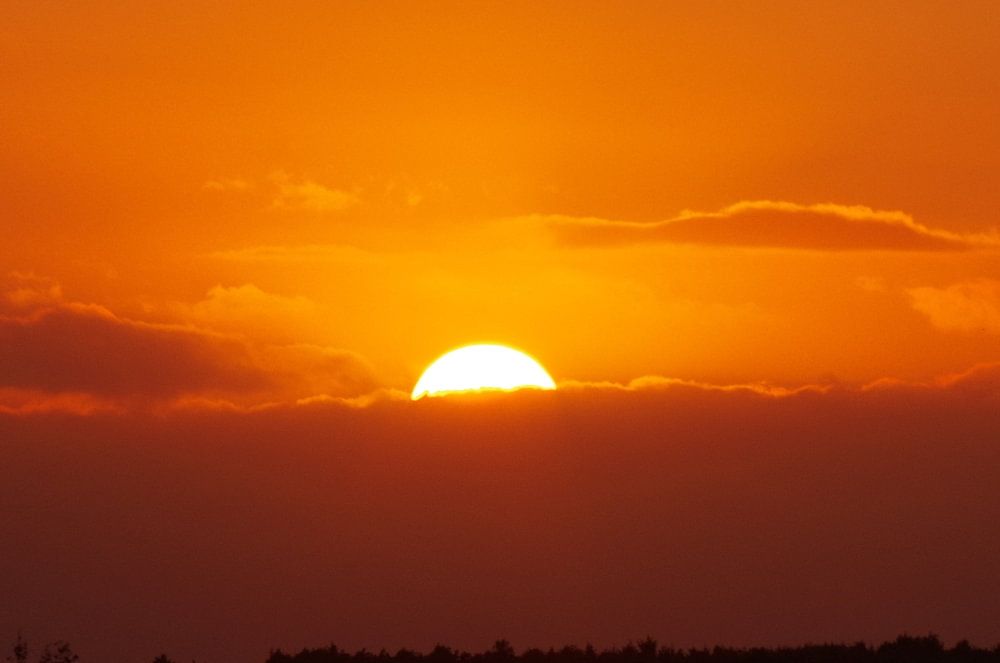 Rode hemel over het fjord bij Egense in Denemarken. De zon verdwijnt achter een wolkendek en verlicht het water niet maar de lucht wel.