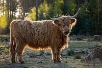Rode Schotse hooglander in het avond (tegen) licht. Rode schotse hooglander op de hei. Naast rode en zwarte komen er ook blonde varianten voor. Koeien hebben wijd uitstaande, naar boven gerichte horens, terwijl die van de stieren horizontaal naar voren staan.