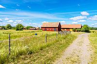 Rode houten huizen en pad op het eiland Sladö in Zweden.