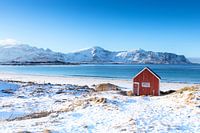 Kleine rode houten hut in de sneeuw op de Lofoten-eilanden in Noorwegen, Ramberg-strand op de achtergrond.