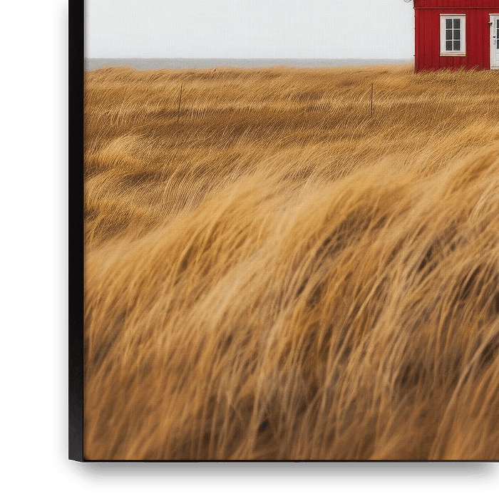 Koop dit landschapskunstwerk Rode hut in een gouden zee van gras van Poster Art Shop op canvas, aluminium dibond, (ingelijste) fotoprint, behang en ArtFrame, op maat geprint in Fine-Art kwaliteit.