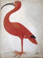 Deze tekening is toegeschreven aan Dorothea Maria Gsell, de dochter van kunstenares en natuuronderzoekster, Maria Sibylla Merian (1647-1717). In 1699 reisde Dorothea samen met haar moeder naar Suriname om allerlei exotische dieren te tekenen. Dorothea slaagde er in het knallende roodoranje verendek van deze ibis goed weer te geven door meerdere laagjes dekkende verf over elkaar aan te brengen.