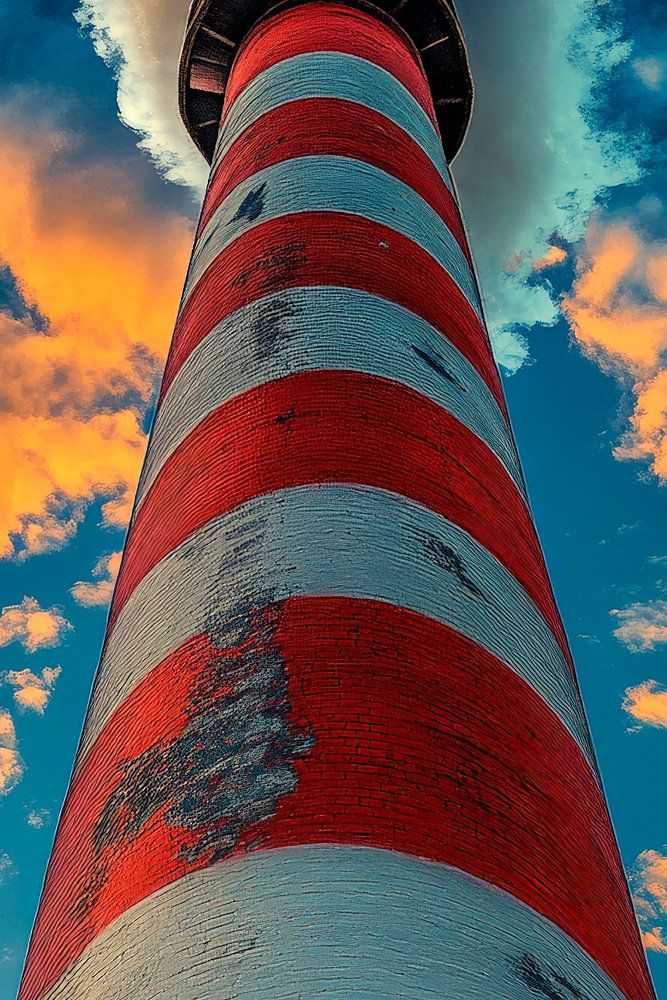 Een majestueuze schoorsteen met opvallende rode en witte strepen die oprijst naar de hemel en wordt omringd door dramatische wolken. De warme kleuren van de zonsondergang geven het tafereel een dynamische sfeer. Ideaal voor een moderne woonkamer die een vleugje industriële charme en stijlvolle inspiratie wil uitstralen.
