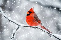 Te midden van de zachte sneeuw schittert een felrode kardinaal op een tere tak. Zijn prachtige verenkleed steekt majestueus af tegen de koele, grijze achtergrond, terwijl de sneeuwvlokken dansen in het winterse licht. Een stralend accent in de ijzige stilte, dat de schoonheid van het koude seizoen in al haar pracht weerspiegelt.