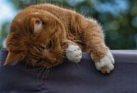 Mijn rode met witte poes Bella liggend op het paviljoen.