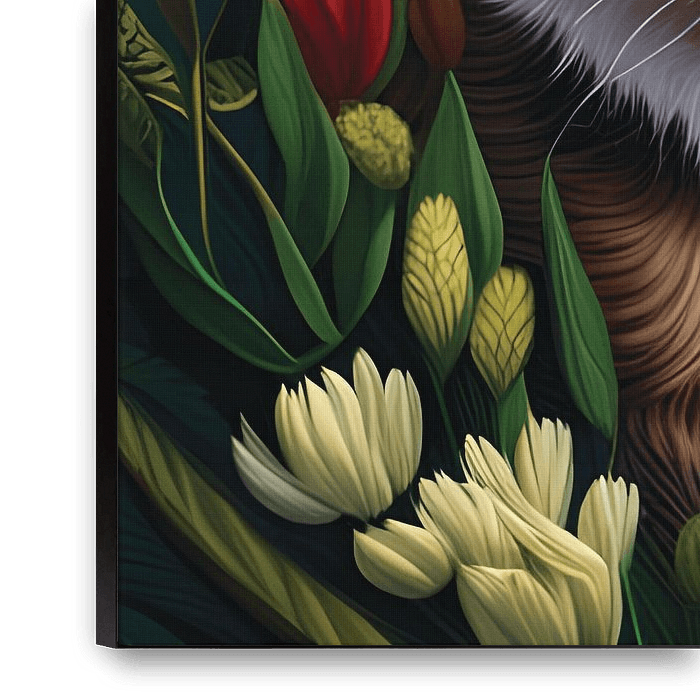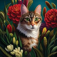 In dit werk gegenereerd met AI en mijn fantasie zie je een rode kater zittend in een veld met prachtige rode bloemen. Een verschillende tinten groen en geel steken af tegen het bijna petrol blauwe achtergrond. Geïnspireerd door Frida kijkt deze kat je tussen de levendige kleuren net niet recht aan.