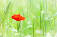 Foto van een rode klaproos in het groene korenveld. Kernwoorden: soft, helder en lieflijk!
