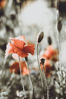 Een veld vol klaprozen, waarvan ik er eentje “in het zonnetje” heb gezet. Mooi tegenlicht door laagstaande zon, in de avond. Het beeld heb ik voorzien van een “grunge” edit, zodat het net niet helemaal zwart-wit is. Hierdoor komt het rood mooi uit.