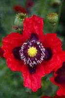 Een rode klaproos bloeit op een groene weide in felrode kleuren, in staand formaat.