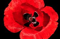 Een close-up foto van een rode papaver. De bloembladeren glanzen en de rode kleur steekt mooi af tegen de zwarte achtergrond. In het midden van de bloem heeft het zwart een wit randje.