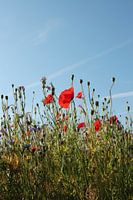 Staande foto van rode klaprozen tegen een blauwe lucht gefotografeerd, omringt met andere wilde bloemen.