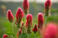 Een close up van rode klaver die in het voorjaar in de berm groeit. Mooi contrast tussen groen en rood met sterke scherpte diepte.