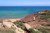 De noordkust van Menorca kenmerkt zich door prachtig rood gesteente. De bergen steken met hun wijnrode kleur prachtig af tegen het groene bos, de strakblauwe zee en het gouden strand.