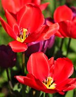 Een foto van rode tulpen in mijn tuin. De kelken zijn open zodat de stamper en meeldraden zichtbaar zijn. De bloembladen glimmen in het zonlicht.