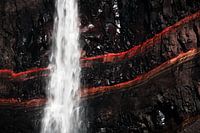 De rode lijnen in het gesteente zijn gevormd door gebakken klei na een vulkaan uitbarsting.