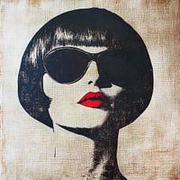 Abstract zwart-wit silhouet van een stijlvolle, mysterieuze Française met rode lippen en een donkere zonnebril.