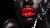 Dit door AI gegenereerde close-up beeld legt de mysterieuze allure vast van een vrouw met rode lippen die een brandende sigaret vasthoudt. De rook die tegen de donkere achtergrond krult, draagt bij aan de mystieke en verleidelijke sfeer. De felrode lippen, die contrasteren met de schaduw, trekken onmiddellijk de aandacht en geven de foto een sensuele en fascinerende noot. De fijne details van de rook die zich elegant rond de sigaret wikkelt en de intense schaduwen en lichten benadrukken de diepte en dramatiek van de scène. Deze compositie vangt de essentie van mysterie en verleiding en zal iedereen aanspreken die op zoek is naar een kunstzinnige en boeiende weergave van sensuele elegantie.