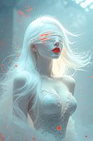 Een prachtige vrouw, met een bleke huid en lange witte haren, heeft rode lippen en een witte blinddoek voor haar ogen. Zij draagt een sexy kanten korset met witte bloemetjes er op. De rode accenten op de blinddoek en rond haar lichaam zijn een mysterie, is het echt of is het de verbeelding? De wind waait door haar lange haren, daardoor…