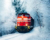 Rode locomotief in sneeuwwit winterlandschap