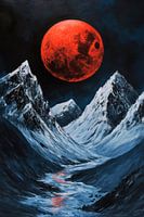 Een fascinerend landschapsschilderij neemt je mee naar een mystieke wereld waar een robijnrode maan over majestueuze, besneeuwde bergen schijnt. De contrasterende kleuren en diepe schaduwen geven het kunstwerk een dramatische uitdrukking. Ideaal voor de woonkamer, het creëert een boeiende sfeer en stimuleert de verbeelding.