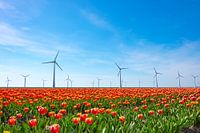 Rode met gele tulpen op in de polder in flevoland met windturbines op de horizon tijdens een mooie dag in de lente. Tulpen zijn een beroemd Nederlands symbool en een belangrijk landbouwexportproduct voor Nederland.