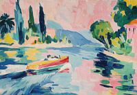 Dit levendige, impressionistische schilderij toont een kleine motorboot in rode en gele tinten die lichtjes naar rechts over het water glijdt. Het wateroppervlak glinstert in blauwe en groene tinten, met zichtbare penseelstreken die beweging en diepte overbrengen. Links rijzen slanke, donkergroene bomen op, waarachter een lichtroze…