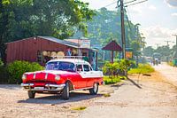 Een felrode oldtimer auto parkeerde aan de kant van de weg. Overal is wel iemand te vinden die je ergens heen wilt brengen tegen betaling.