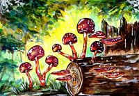 een traditioneel aquarelkunstwerk van vele kleine rode paddestoelen die groeien uit een oud stuk hout ergens in het bos.