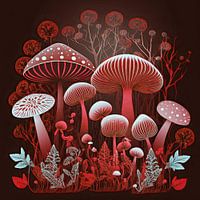 Een semi-abstracte illustratie voor een kinderkamer die de verbeelding prikkelt. Het kunstwerk toont een betoverend boslandschap met rode paddestoelen in verschillende vormen en maten. De donkere achtergrond geeft een dromerige sfeer aan het werk. Deze…