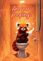 Een pluizige rode pandabeer zit op een toilet in deze luchtige illustratie. Hij gluurt naar buiten met een lieve maar verlegen blik alsof hij verbaasd is dat hij betrapt wordt. Daarboven staat de tekst "Ben je aan het poepen?" met een humoristische clou, waardoor het werk zowel vertederend als grappig is. Schilderachtige streken en spetteraccenten geven het kunstwerk energie en een speelse handgemaakte stijl. Dit kunstwerk is ideaal om een badkamer mee op te fleuren of een kinderkamer mee op te vrolijken en biedt een onweerstaanbare mix van humor en charme. Fans van rode panda's zullen vooral de ondeugende schattigheid waarderen.