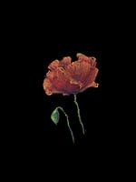 Red Poppy Blossom on Black Background is een pastel schilderij in portret formaat geschilderd door de kunstenaar Karen Kaspar. Een prachtige delicate klaproosbloesem in heldere rode en oranje tinten en een groene knop zijn geschilderd op een zwarte achtergrond. 430