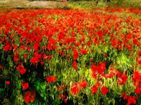 Gebaseerd op mijn eigen foto is dit een digitaal schilderij in impressionistische stijl met rode klaprozenvelden in Umbrië, Italië. In de maand mei barsten veel van de velden in de vallei onder ons huis in Midden-Italië plotseling in kleur uit, vol felrode klaprozen. Klaprozen zijn de meest verbazingwekkende wilde bloemen, ze houden van verstoorde grond, dus omgeploegde landbouwgrond is de ideale plaats voor hen om te groeien. In deze periode van natuurschoon zie je overal velden met rode klaprozen, of klaprozen in de heggen of aan bosranden. Gewoonweg prachtig. Ik wilde dat moment vastleggen waarop je naar de rode klaproosvelden staat te kijken. Je oog richt zich niet op één klaproos in het bijzonder, maar neemt het hele glorieuze schouwspel in je op. Het rood versmelt bijna tot grote kleurvlakken en contrasteert prachtig met het gedempte groen van het grasland.