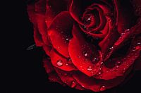 Foto van een rode roos met druppels condens liggend op de tere rozen blaadjes .