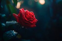 Een betoverende rode gloed te midden van de zachte glinstering van waterdruppels die als kostbare juwelen op de bloemblaadjes rusten. Deze indrukwekkende roos, ingebed in een mystieke sfeer, brengt een elegante toets in elke woonkamer en creëert een uitnodigende, romantische sfeer. Ideaal voor een blikvanger die harten betovert.