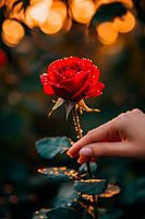Een rode roos schittert in het zachte licht, haar levendige bloemblaadjes glinsteren door de dauw. De delicate hand die de roos vasthoudt, geeft het moment een romantische intimiteit. Dit meesterwerk van de natuur brengt warmte en elegantie in elke woonkamer, ideaal voor een uitnodigende sfeer en inspirerende gesprekken.