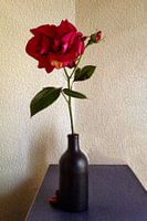 De rode roos in dit werk komt uit mijn eigen tuin. Ze heeft een krachtige geur, de typische 'rozengeur' die verwerkt wordt in zeepjes, parfums en geurige oliën. Als deze roos in mijn tuin bloeit, ga ik elke dag even langs voor een 'geuren-bad'. Het ruikt zo heerlijk en werkt zo ontspannend.