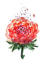 een traditioneel aquarelkunstwerk van een grote rode roos met groene bladeren en kleurrijke spatten.