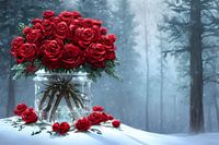 Een glazen vaas vol rode rozen in een besneeuwd winter bos.