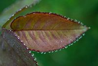 Red Rose Leaves with Morning Dew 1005C - een cluster van 3 jonge rode rozenblaadjes met zware ochtenddauwdruppels op de uiteinden. De achtergrond is zacht middengroen. De sfeer is romantisch. In vogelperspectief zijn de hele randen van de bladeren te zien met de druppels rustend op de randen en uiteinden van de bladeren. Het is een mooie zonnige vroege herfstochtend en de natuur is nog aan het ontwaken.