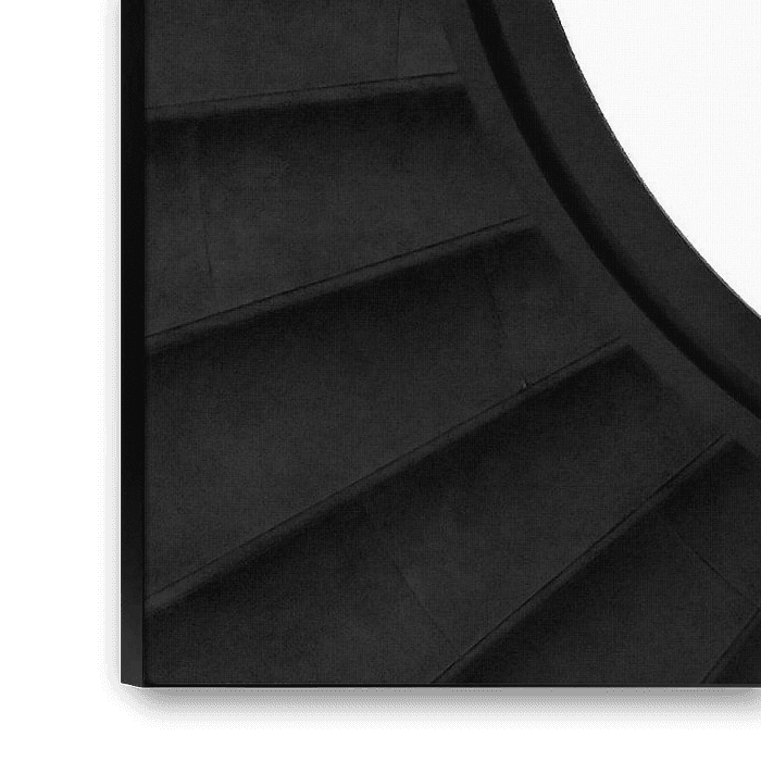 vangt het moment tussen beweging en stilstand - een elegante vrouw wiens rode hoge hakken een opvallend accent worden in het samenspel van licht, schaduw en geometrie. De wenteltrap trekt het oog hypnotiserend de diepte in en symboliseert het eindeloze ritme van klimmen en terugkeren.