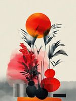 Een hedendaags abstract kunstwerk dat gedurfde rode en oranje zonnen mengt met zachte zwart-witte plantensilhouetten. De compositie combineert natuurlijke elegantie met geometrische balans en roept een gevoel van harmonie op tussen organische en gestructureerde vormen.