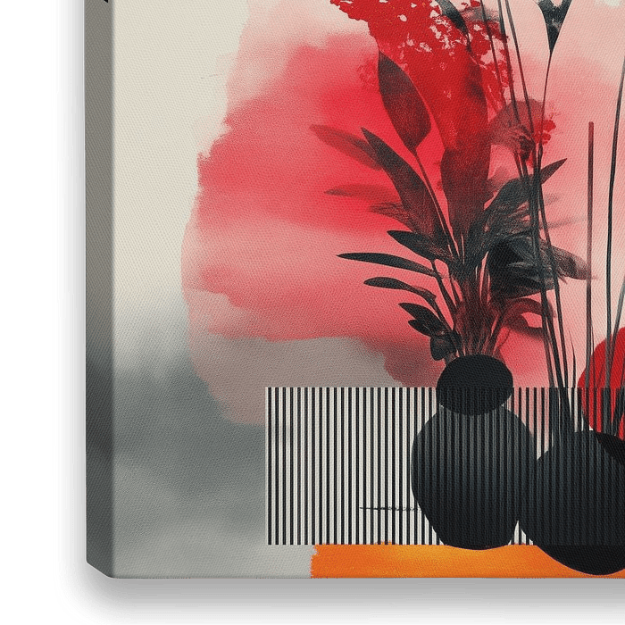 Een hedendaags abstract kunstwerk dat gedurfde rode en oranje zonnen mengt met zachte zwart-witte plantensilhouetten. De compositie combineert natuurlijke elegantie met geometrische balans en roept een gevoel van harmonie op tussen organische en gestructureerde vormen.