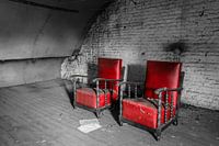Twee prachtige rode stoelen, achtergelaten door de laatste bewoners, op de zolder van een verlaten en vervallen villa. Gebruikt in een rijk verleden, nu vergeten en verlaten, maar nog altijd prachtig, staan ze te verstoffen in de zolderruimte.
