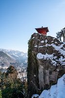 Rode tempel in Yamadera nabij Sendai en Yamagate in Japan op een besneeuwde bergtop tijdens een zonnige winter dag. Met zicht op de bergen in de verte.